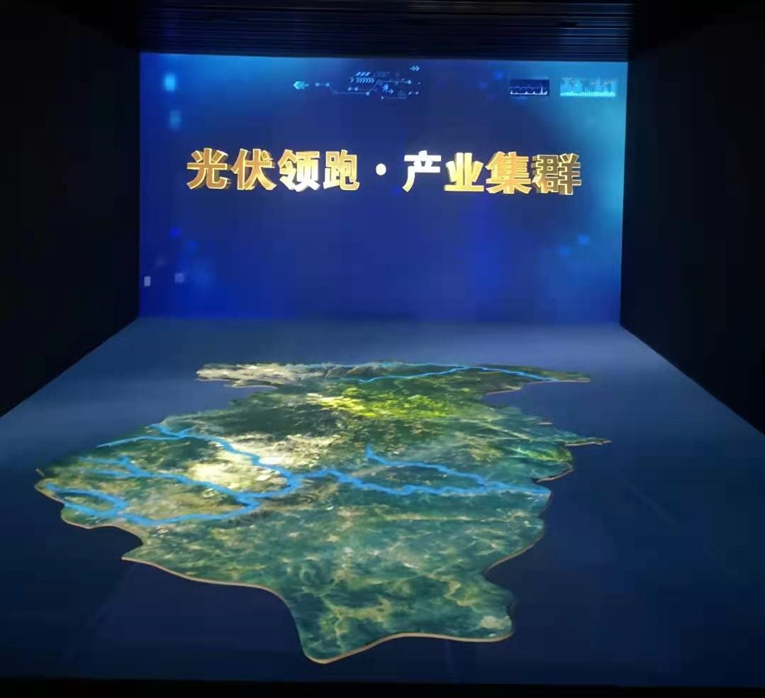 該區(qū)域?yàn)?2臺(tái)投影機(jī)投射出的L型裸眼3D沙盤,展出了,鐵路和公路交通圖,礦產(chǎn)區(qū)域分布情況;以及“光伏領(lǐng)跑 綠色發(fā)展”主題影片,一同感受陽(yáng)泉光伏領(lǐng)跑者示范基地一路走來(lái)的光輝歷程。